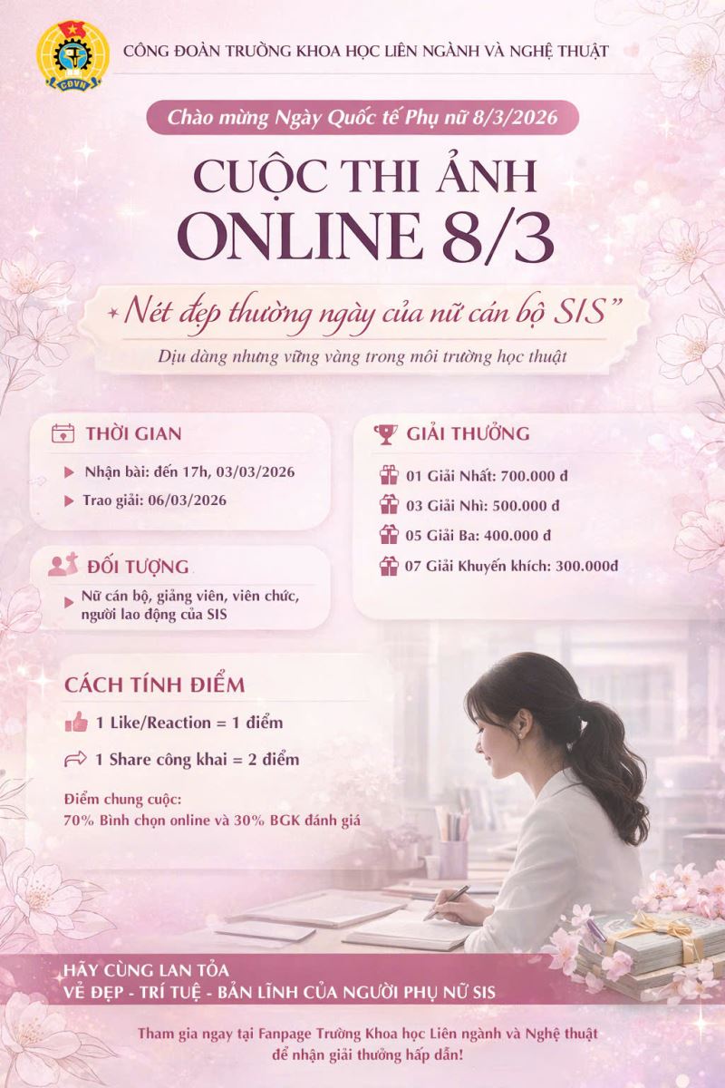 Trao giải: Tại Lễ kỷ niệm Ngày Quốc tế Phụ nữ 8/3 (9h00, ngày 06/3/2026, Phòng 701-703, cơ sở Mỹ Đình).