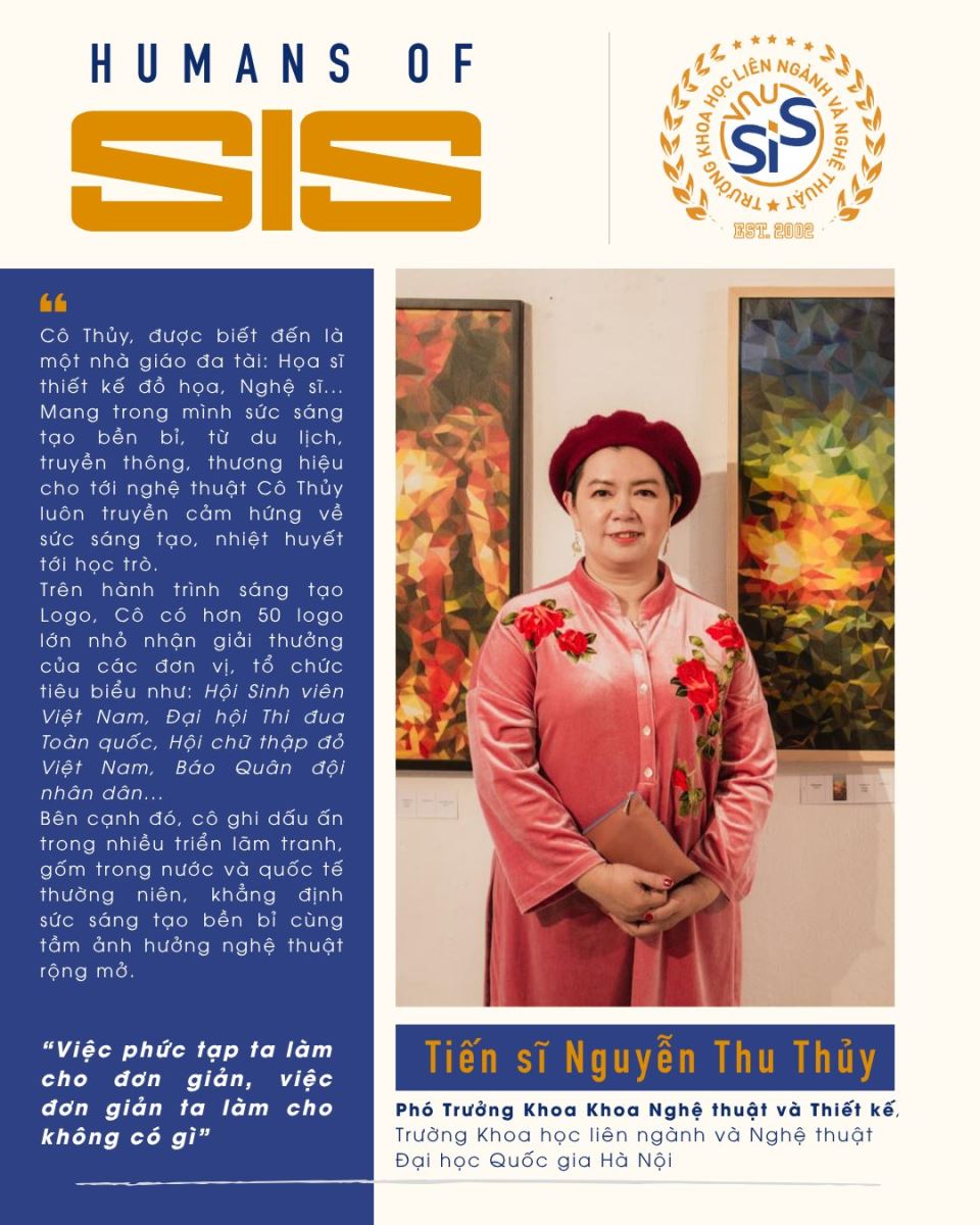 Có những người thầy không chỉ đứng trên bục giảng, mà còn trở thành nguồn cảm hứng sáng tạo bất tận cho học trò. Tiến sĩ – Họa sĩ thiết kế đồ họa Nguyễn Thu Thủy, hiện là Phó Trưởng Khoa Nghệ thuật và Thiết kế, Trường Khoa học Liên ngành và Nghệ thuật (VNU SIS), chính là một nhà giáo như thế – tận tâm, đam mê và luôn sáng tạo không ngừng.