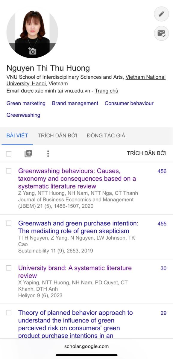 Tính đến thời điểm hiện tại, cô có hơn 1.000 trích dẫn trên Google Scholar, thể hiện tầm ảnh hưởng học thuật mạnh mẽ trong lĩnh vực Marketing và truyền thông.