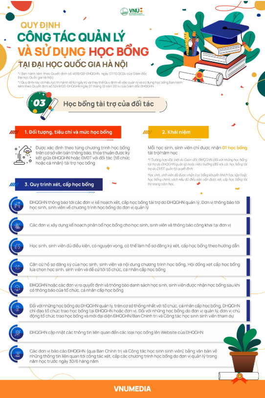 3. Bảo đảm cấp đúng, đủ và sử dụng học bổng theo yêu cầu, mục đích của nhà tài trợ/đơn vị cấp học bổng và định hướng cấp học bổng của ĐHQGHN.