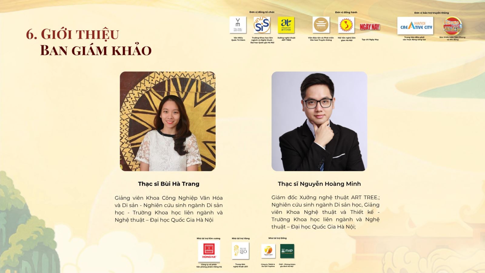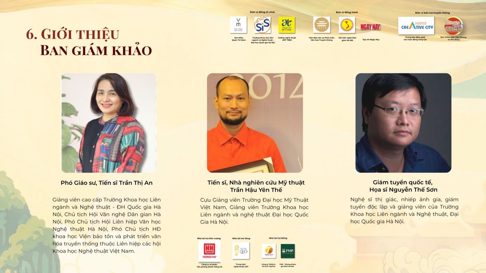 Hội đồng Ban Giám khảo gồm các chuyên gia uy tín trong lĩnh vực mỹ thuật và di sản đến từ Đại học Quốc gia Hà Nội (VNU-SIS) như PGS.TS Trần Thị An, TS.Trần Hậu Yên Thế, TS. Giám tuyển độc lập Nguyễn Thế Sơn cùng các giảng viên, nhà nghiên cứu và chuyên gia trong lĩnh vực văn hóa, nghệ thuật.