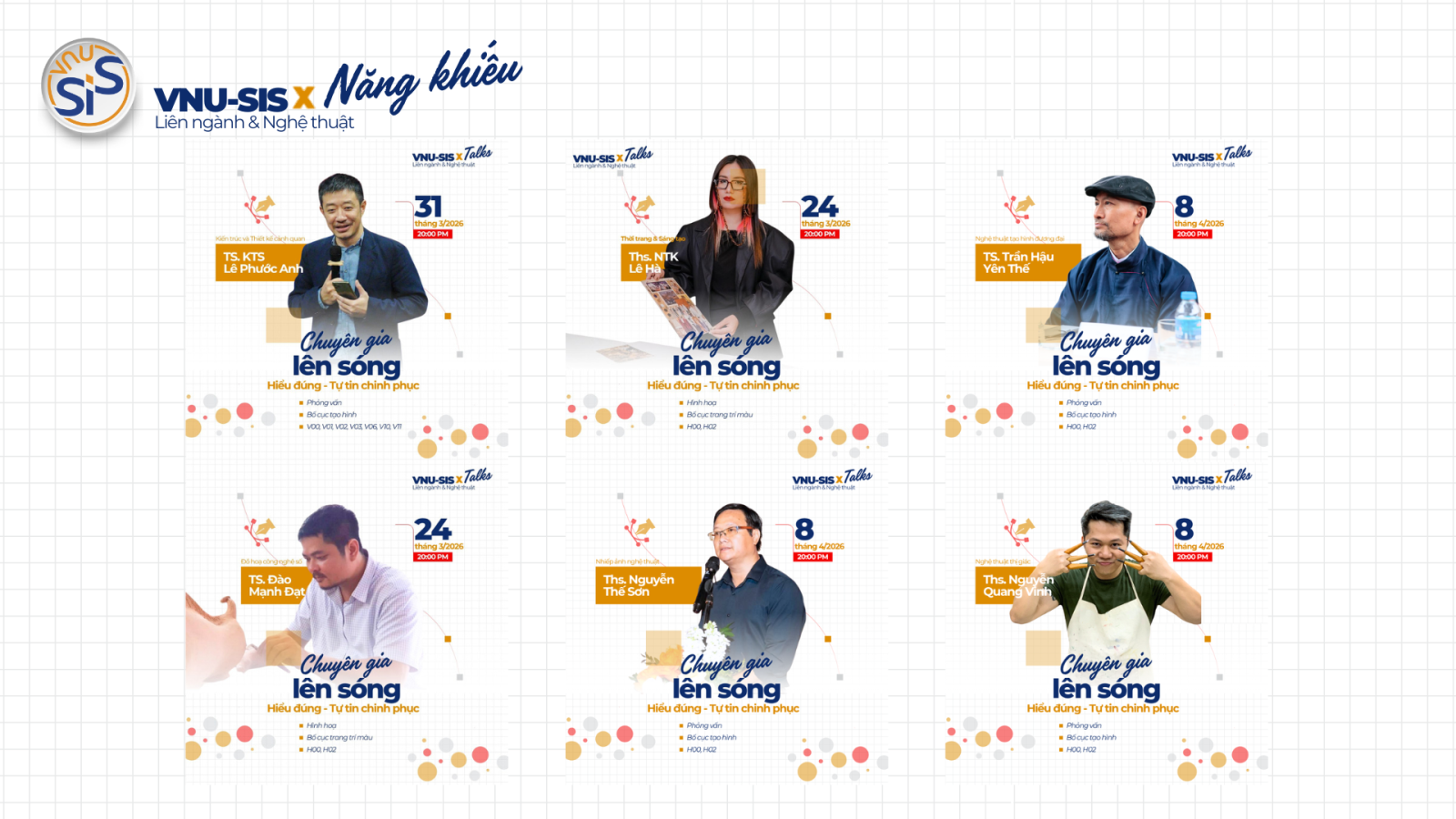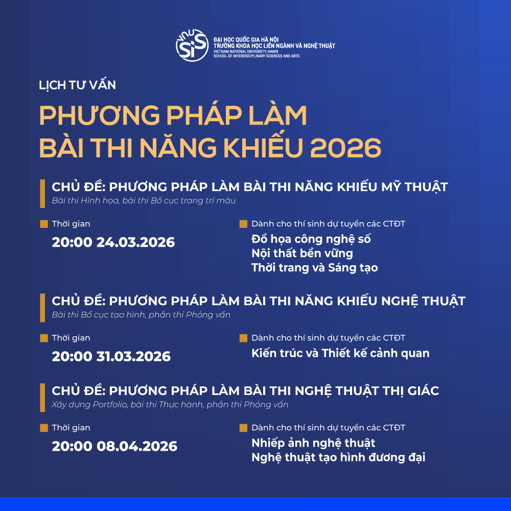 Series “Giải mã kỳ thi năng khiếu” được thiết kế chuyên sâu nhằm hỗ trợ thí sinh đăng ký vào các chương trình cử nhân khối Nghệ thuật của Nhà trường. Chương trình không chỉ dừng lại ở việc cung cấp thông tin tuyển sinh mà còn là những buổi tham vấn chuyên sâu, giúp thí sinh thấu hiểu bản thân trước khi đặt bút chọn ngành. Các chuyên gia từ VNU-SIS sẽ bóc tách trực diện các tiêu chí chấm điểm – vốn là "ẩn số" đối với nhiều thí sinh – để làm rõ rằng nhà trường không tìm kiếm những kỹ thuật hoàn hảo mà ưu tiên tư duy giải quyết vấn đề và tiềm năng sáng tạo riêng biệt.